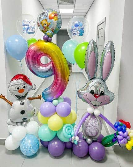 Кроме того, с помощью воздушных шаров можно создать разнообразные фигуры, которые будут украшением для фотозоны или декорации на сцене. Например, можно сделать большую фигуру Багза Банни или его друзей — Даффи Дака, Порки Пайна, Лоло Банти и многих других. Эти фигуры можно использовать для украшения зала, фотозоны или сделать из них оригинальный подарок для именинника.